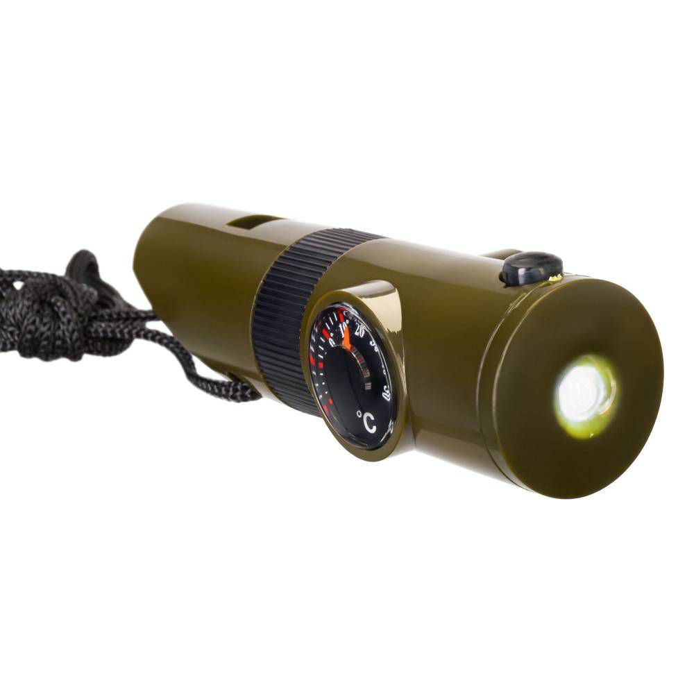 - Πολυεργαλείο 6 σε 1: σφυρίχτρα, θερμόμετρο, πυξίδα, κάτοπτρο, μεγεθυντικός φακός, φακός